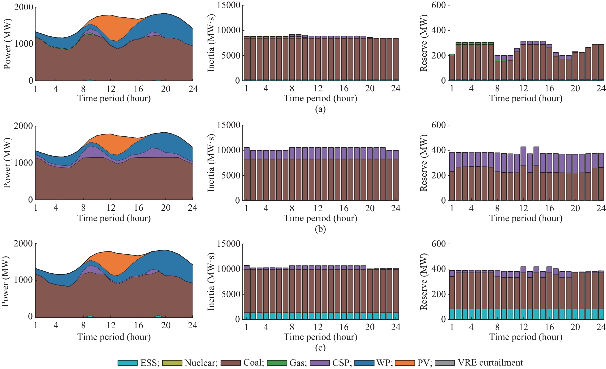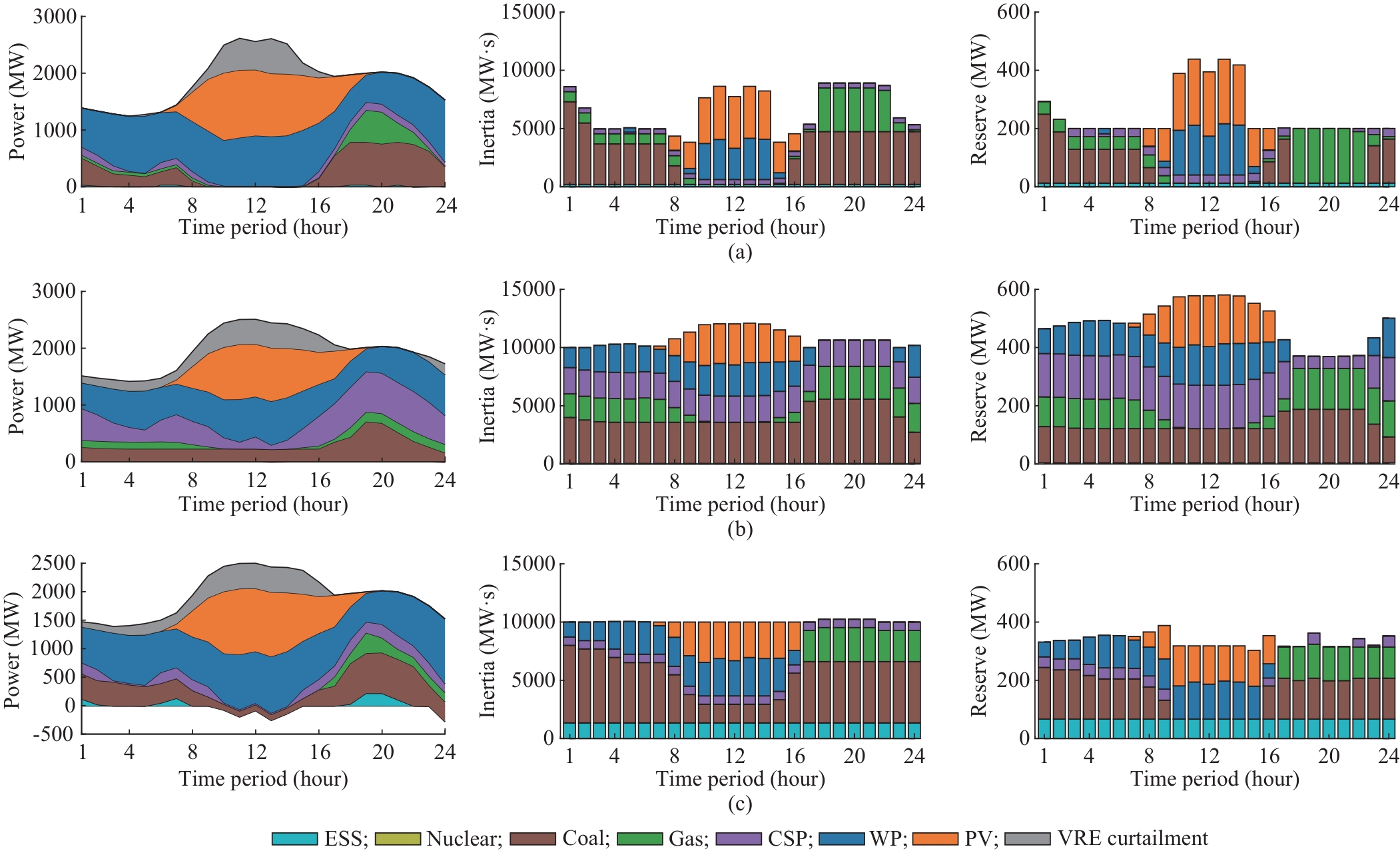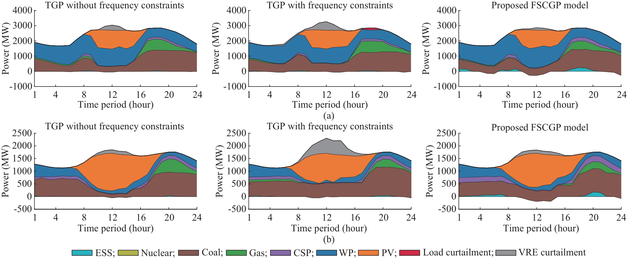 Abstract:Variable renewable energy (VRE) integrated via non-synchronous inverters exhibits low inertia and fluctuating output, posing substantial frequency security challenges for future power systems. When frequency security constraints are omitted from generation planning, the resulting low-inertia generation portfolios often fail to meet critical frequency requirements. To address this issue, this paper proposes a novel frequency security constrained generation planning (FSCGP) model that leverages the frequency support potential of diverse power sources, including conventional thermal generators (CTGs), VRE units, concentrating solar power (CSP) units, and energy storage systems (ESSs). A physics-data hybrid-driven method is introduced to formulate frequency security constraints, enabling accurate representation of diverse frequency regulation characteristics, particularly the fast frequency support capabilities of inverter-based generators (IBGs). To further enhance the computational efficiency, several acceleration techniques are incorporated into the proposed FSCGP model. Case studies based on a modified IEEE RTS-79 system validate the effectiveness of the proposed FSCGP model. The numerical results identify the primary contributors to frequency security under different renewable energy penetration (REP) levels and demonstrate the cost-effectiveness of coordinating various frequency support sources, especially CSP units and IBGs, in mitigating challenges in low-inertia grids.