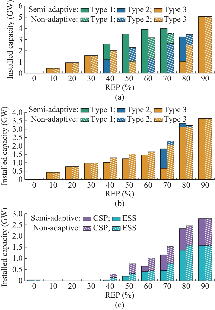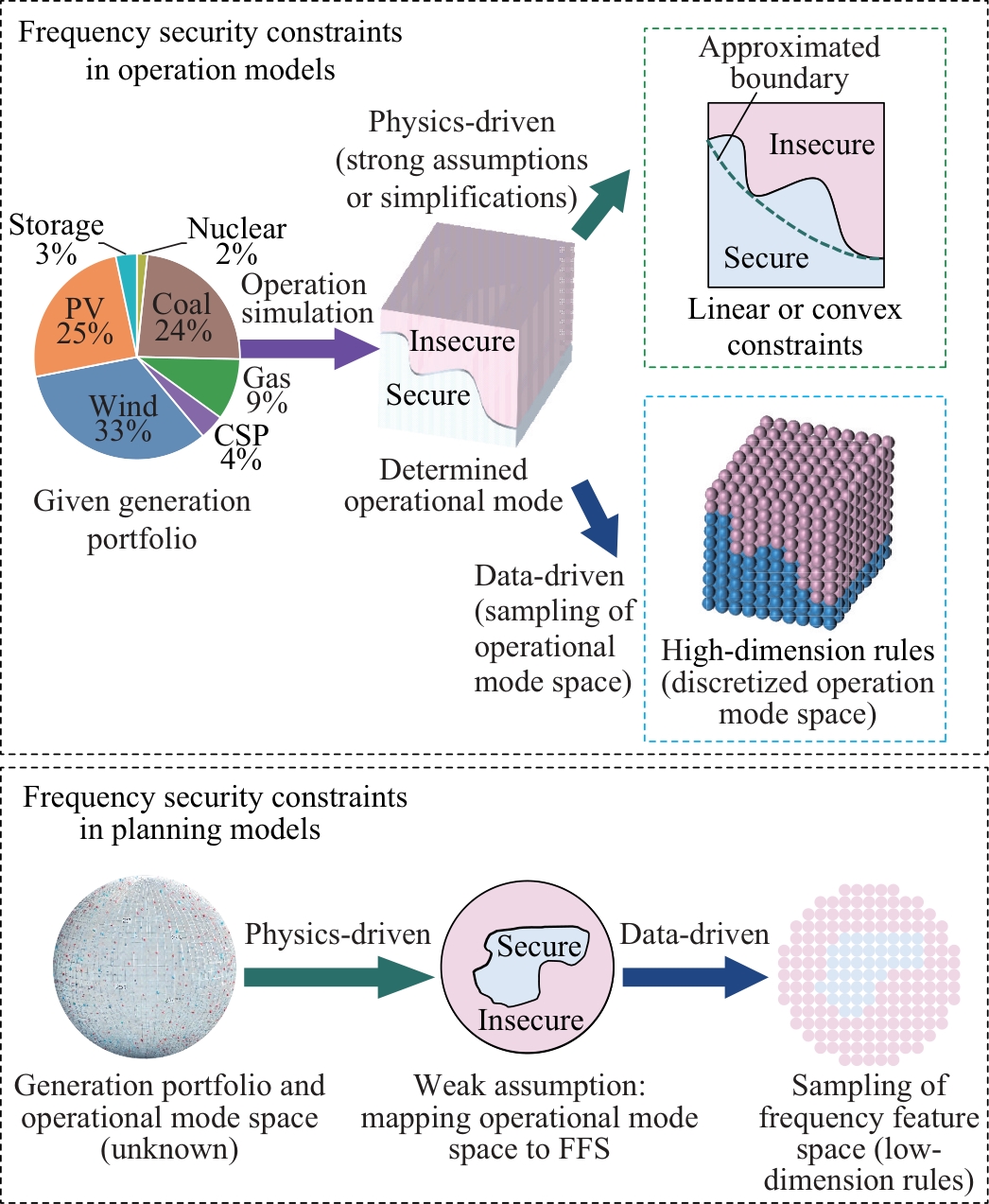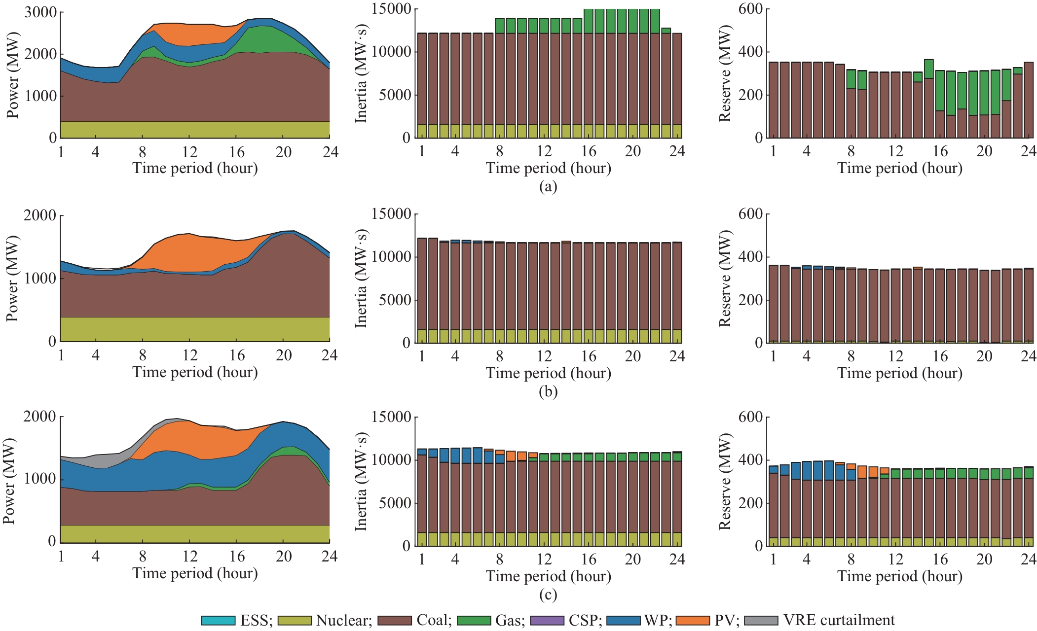 Abstract:Variable renewable energy (VRE) integrated via non-synchronous inverters exhibits low inertia and fluctuating output, posing substantial frequency security challenges for future power systems. When frequency security constraints are omitted from generation planning, the resulting low-inertia generation portfolios often fail to meet critical frequency requirements. To address this issue, this paper proposes a novel frequency security constrained generation planning (FSCGP) model that leverages the frequency support potential of diverse power sources, including conventional thermal generators (CTGs), VRE units, concentrating solar power (CSP) units, and energy storage systems (ESSs). A physics-data hybrid-driven method is introduced to formulate frequency security constraints, enabling accurate representation of diverse frequency regulation characteristics, particularly the fast frequency support capabilities of inverter-based generators (IBGs). To further enhance the computational efficiency, several acceleration techniques are incorporated into the proposed FSCGP model. Case studies based on a modified IEEE RTS-79 system validate the effectiveness of the proposed FSCGP model. The numerical results identify the primary contributors to frequency security under different renewable energy penetration (REP) levels and demonstrate the cost-effectiveness of coordinating various frequency support sources, especially CSP units and IBGs, in mitigating challenges in low-inertia grids.