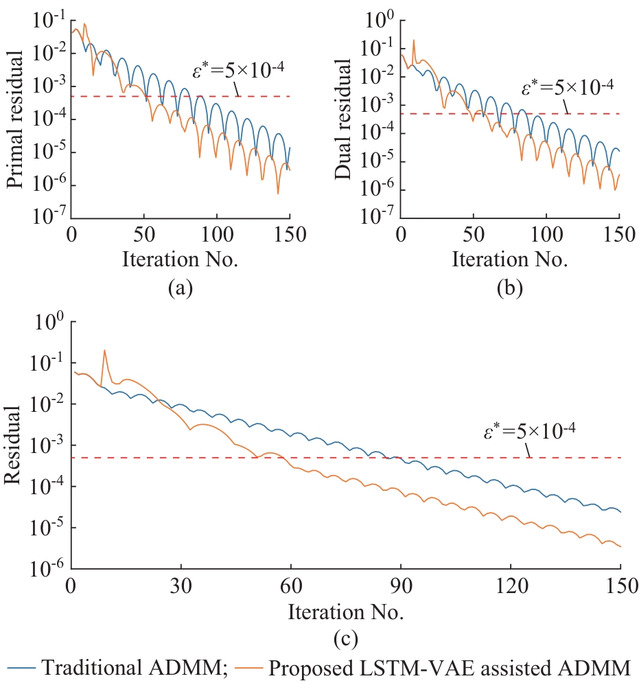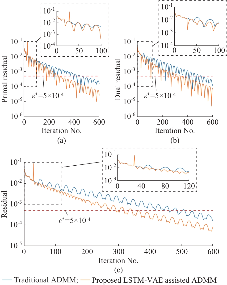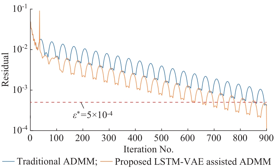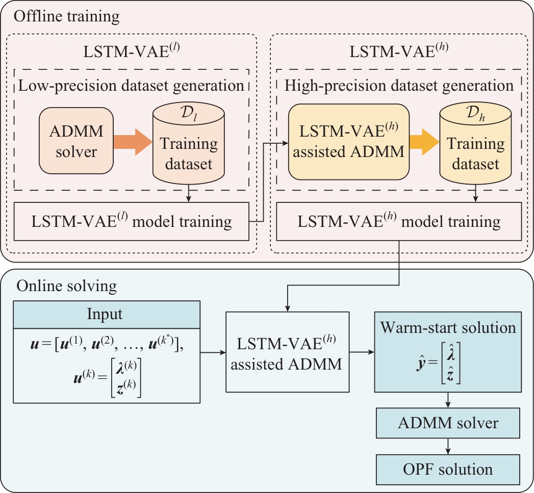 Abstract:As the scale of power system continues to grow, a fast and accurate distributed optimal power flow solver becomes crucial for the effective dispatch of power system. This paper presents a learning to optimize (L2O) approach to accelerating the distributed optimal power flow solving. The final convergence values of global variables and Lagrange multipliers of the alternating direction method of multipliers (ADMM) are estimated as its warm-start solution. A long short-term memory-variational auto-encoder (LSTM-VAE) model is developed as the core for estimating the convergence value, and the LSTM-VAE assisted ADMM is proposed. The LSTM generates low-dimensional representations of global variables and Lagrange multipliers, while the decoder part of VAE reconstructs the high-dimensional asymptotic convergence values. A novel loss function is designed in the form of a quadratic sum penalty term to incorporate the constraint violations of the Lagrange multipliers. Additionally, a two-stage training data generation strategy is proposed to efficiently generate substantial data within a limited amount of time. The effectiveness of the LSTM-VAE assisted ADMM is evaluated using the modified IEEE 123-bus system, a synthetic 500-bus system, and a 793-bus system.