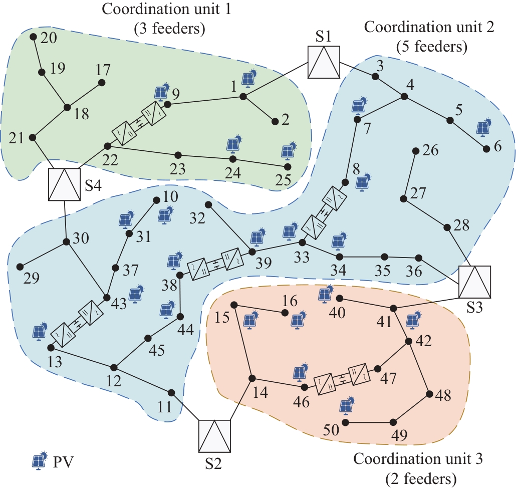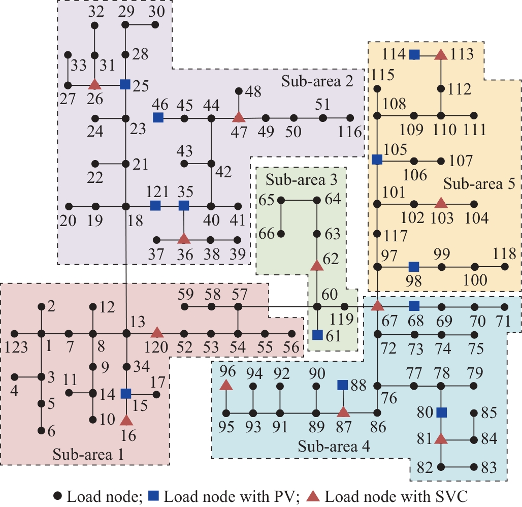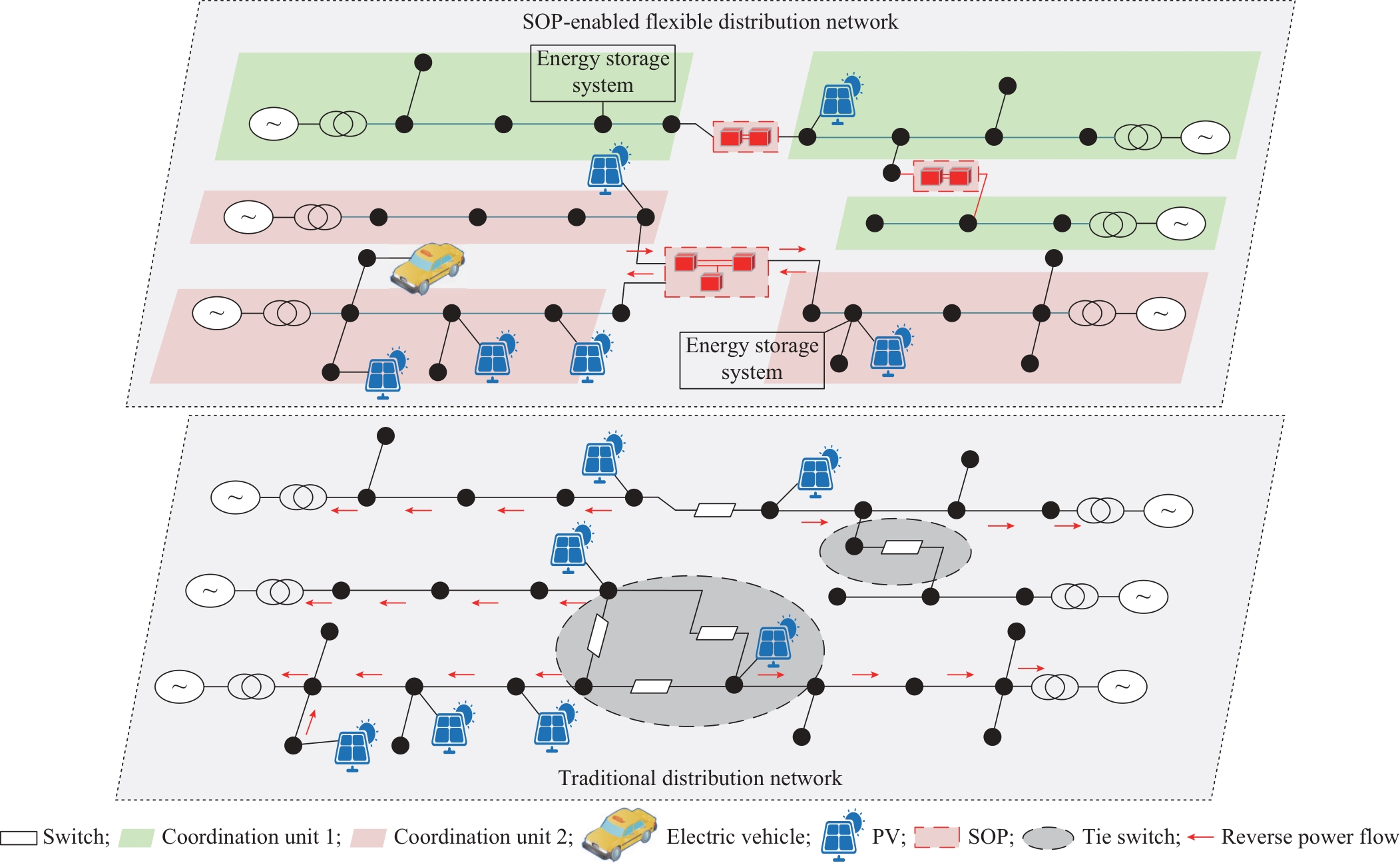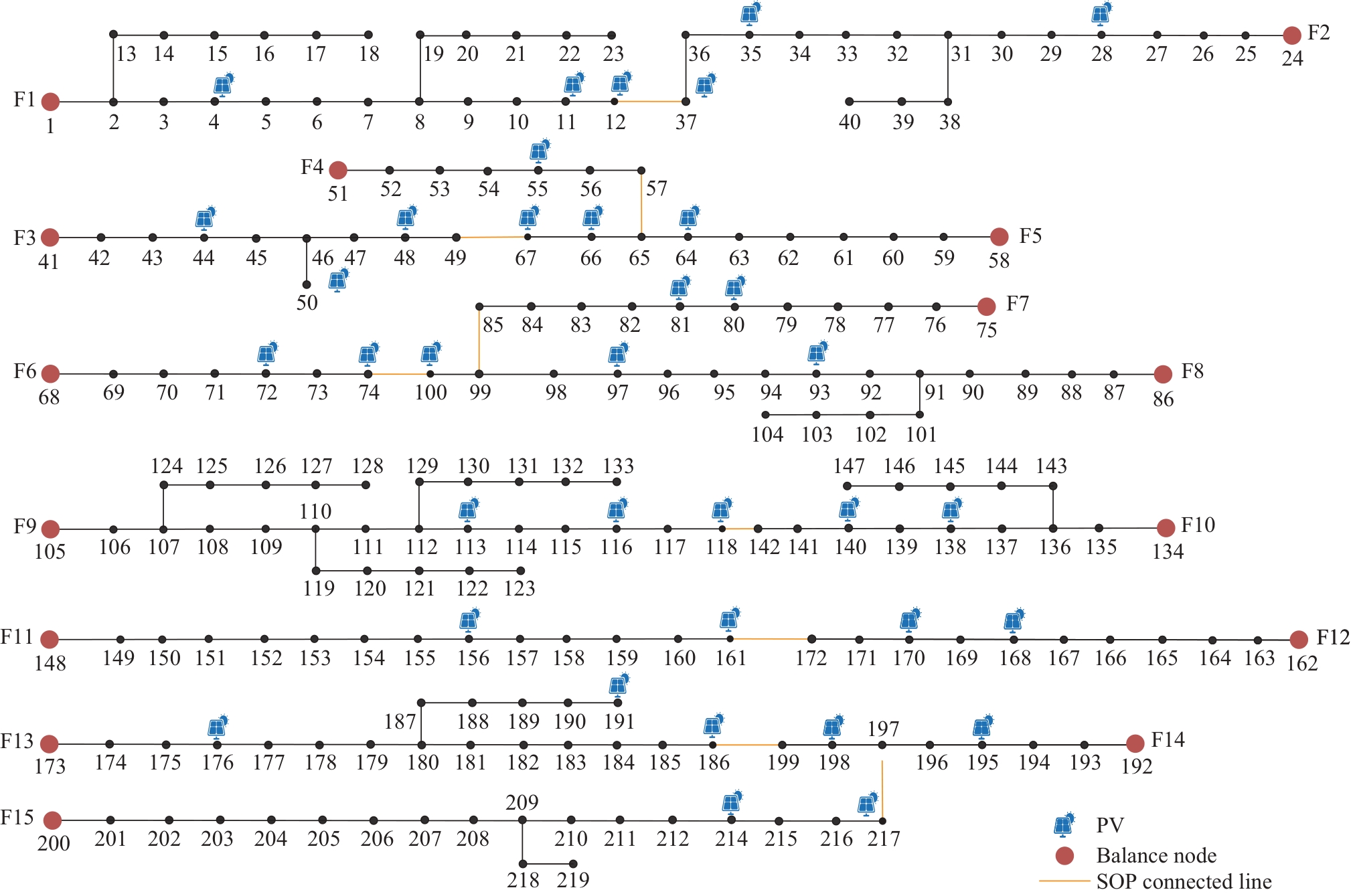 Abstract:To address the limitations of traditional planning methods in handling complex scenarios such as multi-feeder or substation cluster supply under high photovoltaic (PV) penetration, this paper proposes a collaborative configuration optimization method of soft open points (SOPs) and distributed multi-energy stations with spatiotemporal coordination and complementarity to reduce renewable energy curtailment. First, a shared strategy of multiple types of resources is proposed based on an SOP-enabled flexible distribution network. Second, a distributed hydrogen-based multi-energy coupling system (DHMECS) is developed. Then, a DHMECS siting model considering inter-feeder resource sharing is formulated. Finally, a configuration model of SOP and DHMECS is proposed, incorporating a partitioned autonomous operation strategy that considers spatiotemporal coordination and complementarity. The proposed method is validated on the improved Portugal 54-node and 219-node distribution networks, and the results demonstrate that it mitigates severe voltage violations and PV curtailment, enhances partitioned autonomous operation capabilities, and addresses the challenges of complex planning scenarios involving multi-feeder or substation cluster supply.