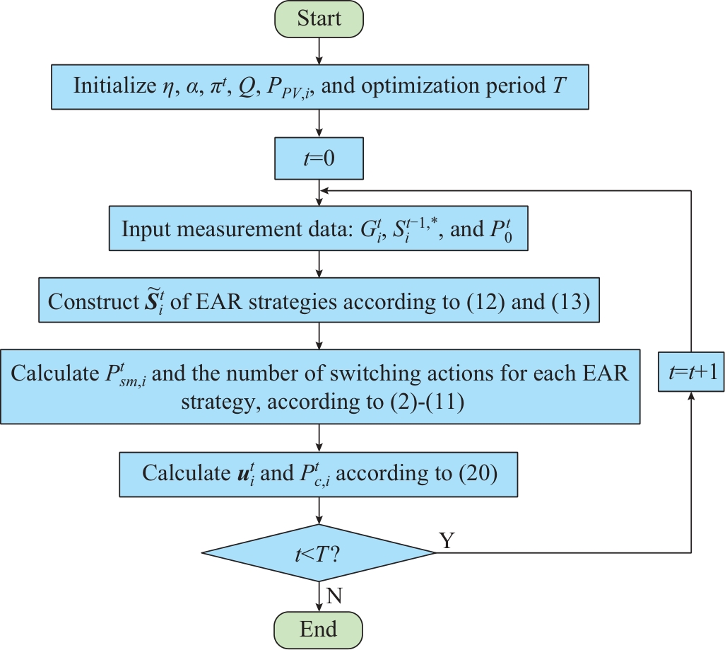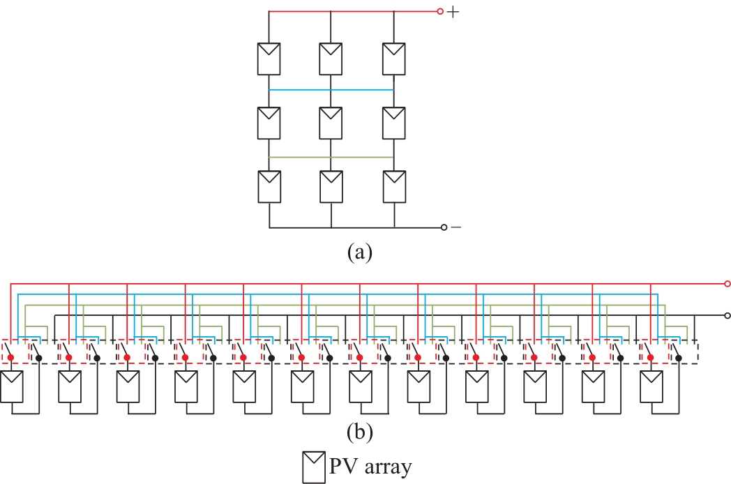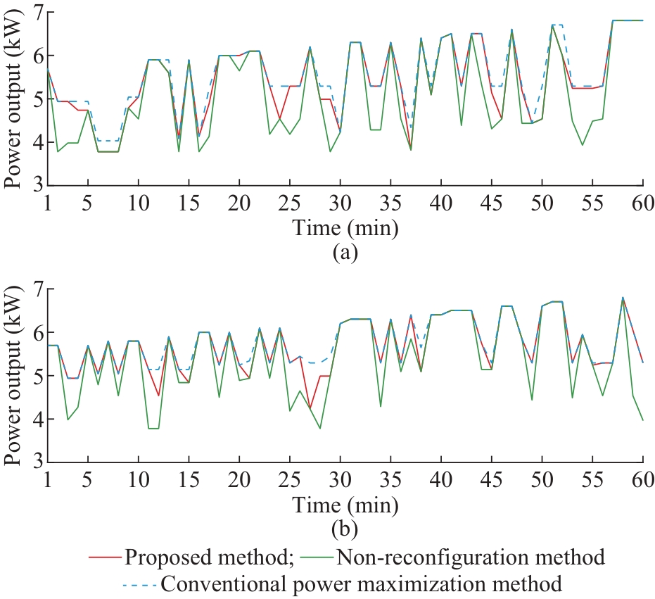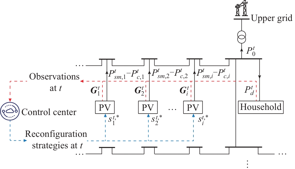 Abstract:The electrical array reconfiguration (EAR) method has become a promising solution to enhance photovoltaic (PV) system performance under partial shading conditions. Existing studies focus on maximizing single-period PV generation but neglect the impact of power fluctuation on grid stability. To address this, we propose a multi-period EAR method for multi-PV systems considering net power fluctuation mitigation. First, we design a multi-period EAR model to maximize total revenue by balancing electricity sales and net power fluctuation penalties, formulated as a stochastic mixed-integer quadratic programming problem. The model incorporates constraints on the average number of switching actions per unit time to ensure practical implementation. Then, to handle the unpredictability of partial shading conditions, we develop a Lyapunov optimization-based online algorithm to decouple the time-coupling constraints involving state transitions. Additionally, we propose a reduced set of EAR strategies to improve the computational efficiency. Numerical studies demonstrate that the proposed method significantly reduces net power fluctuations in distribution networks with high PV penetration rate and enhances total revenue compared with conventional methods.