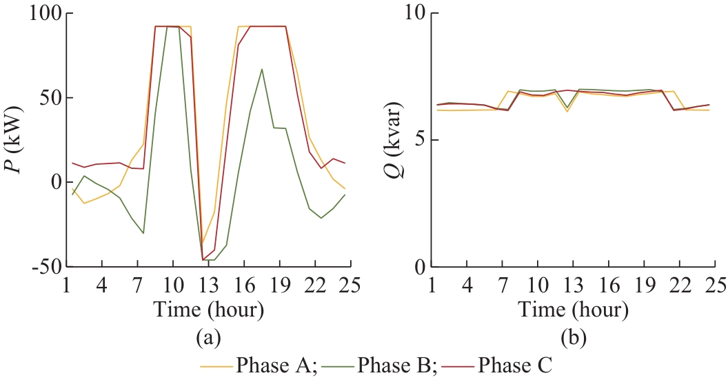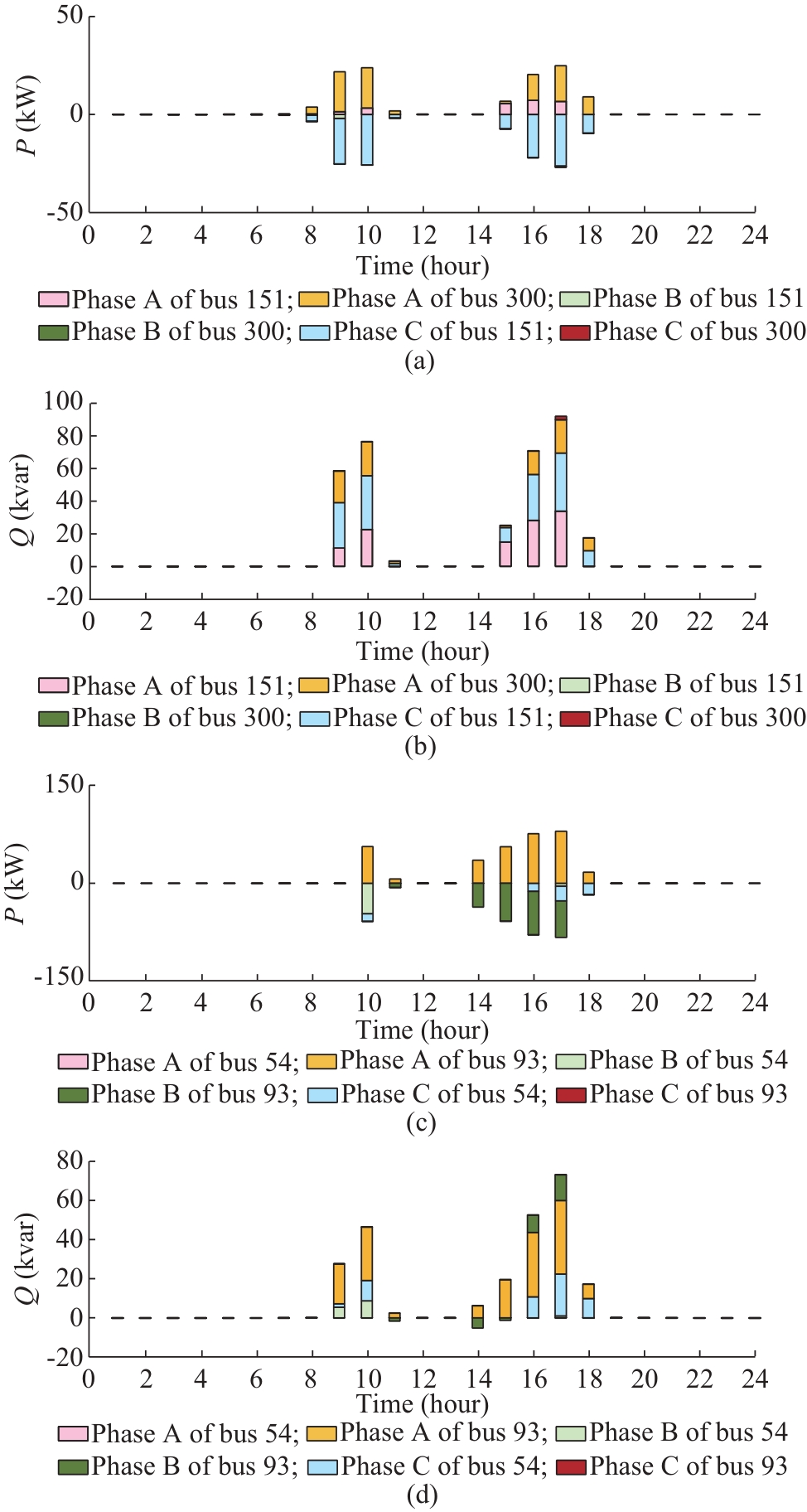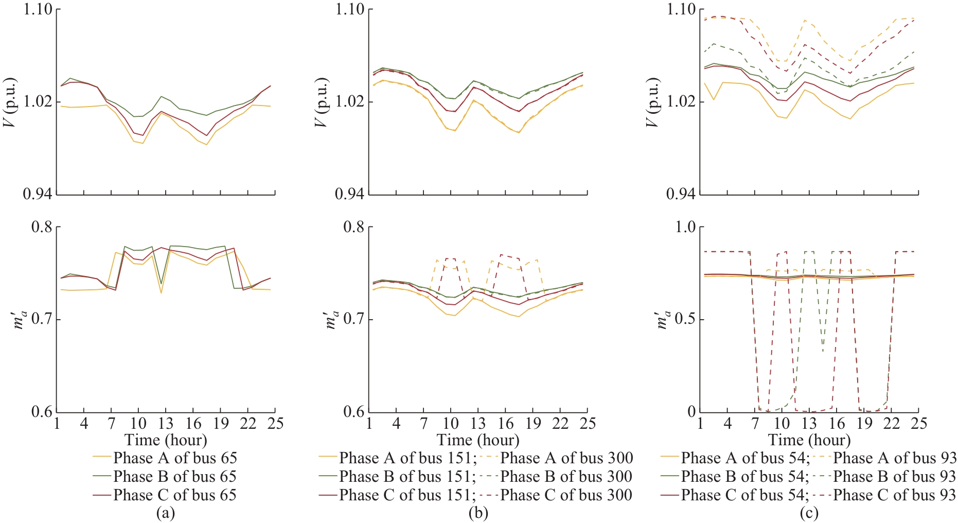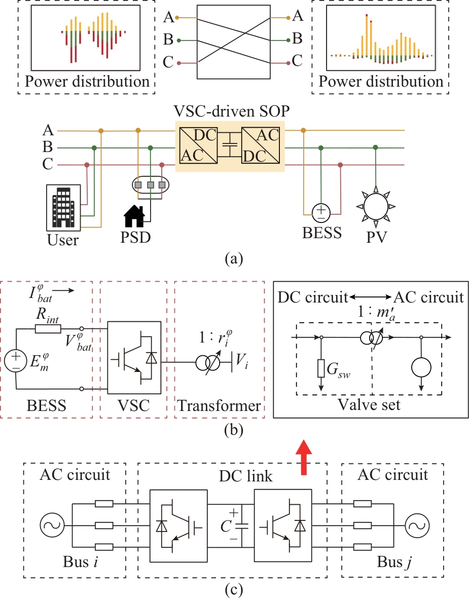 Abstract:This paper proposes an advanced voltage source converter (VSC)-driven model for soft open points (SOPs) and battery energy storage systems (BESSs) to actively balance three-phase distribution networks. The proposed model addresses the phase imbalance caused by the increasing integration of renewable energy and distributed generation. Unlike traditional models, which mainly focus on AC capacity constraints, the proposed model explores the complexities of the DC-link. This allows for a thorough examination of the interactions between active and reactive power, as well as the voltage levels on both the AC and DC sides of VSCs. The relationship between pulse width modulation (PWM) control configurations and VSC power outputs is discussed, enhancing control on both sides of the converters. This improvement also facilitates better cross-phase power transfer through SOPs and enhances the overall balance among the three phases. In addition, the proposed model incorporates the cooperative functionality of VSC-driven BESSs to sustain the phase balance. To further optimize the load distribution, phase-specific dispatching (PSD) is introduced, allowing for the flexible allocation of individual loads to distinct phases. Together, these coordinated technical solutions constitute a systematic optimization strategy. An algorithm is developed to harmonize the VSC-driven modeling for SOPs and BESSs with PSD, thereby improving the computational efficiency in managing power flow and phase balance. The results show that the proposed model significantly reduces losses and enhances the phase balance.